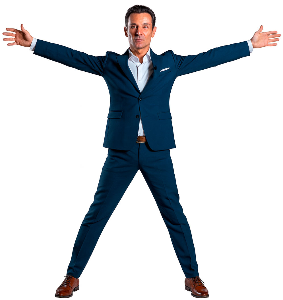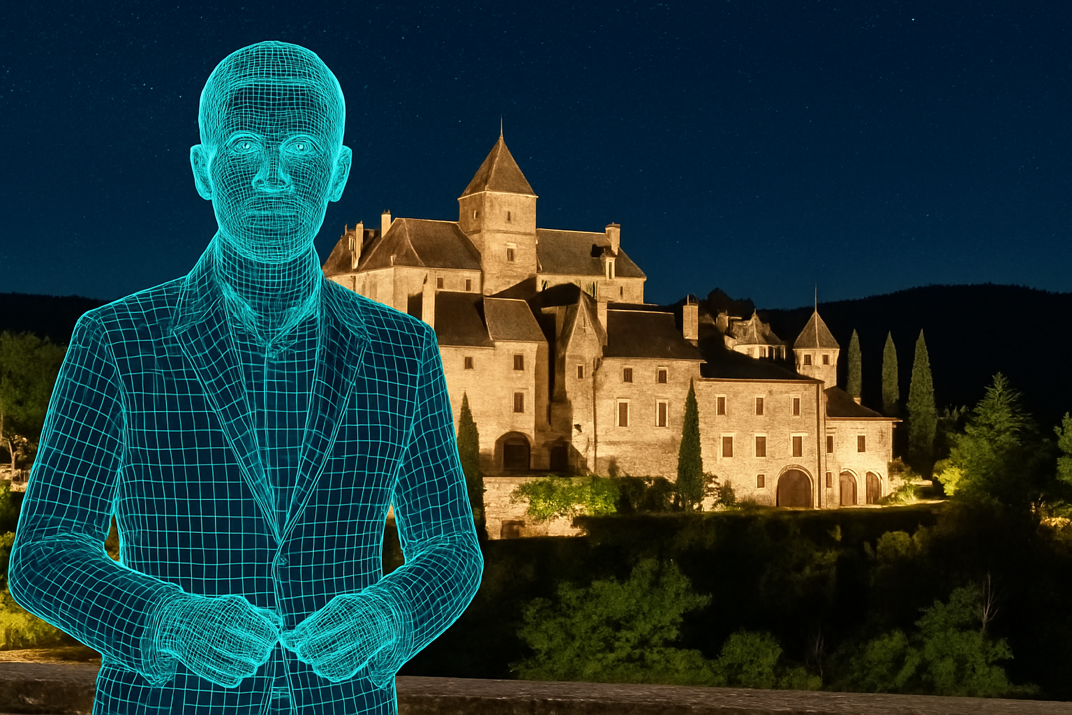 A man in a dark blue suit with a white shirt stands in the foreground, speaking as if presenting on camera. Behind him, a beautifully illuminated medieval stone castle with pointed roofs and towers, surrounded by cypress trees and greenery. The night sky is filled with countless stars, creating a cinematic atmosphere. Smooth camera movement, high-resolution, photorealistic style, warm lights on the castle contrasting with the deep blue starry sky.