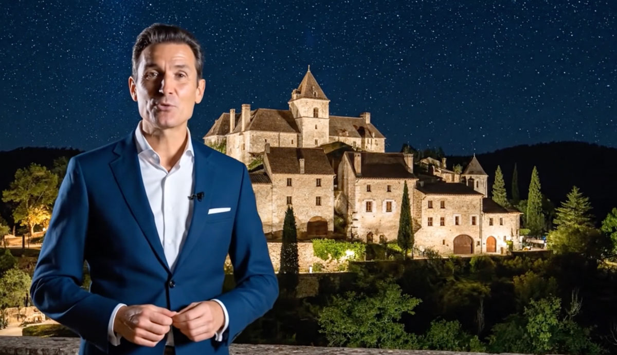 A man in a dark blue suit with a white shirt stands in the foreground, speaking as if presenting on camera. Behind him, a beautifully illuminated medieval stone castle with pointed roofs and towers, surrounded by cypress trees and greenery. The night sky is filled with countless stars, creating a cinematic atmosphere. Smooth camera movement, high-resolution, photorealistic style, warm lights on the castle contrasting with the deep blue starry sky.